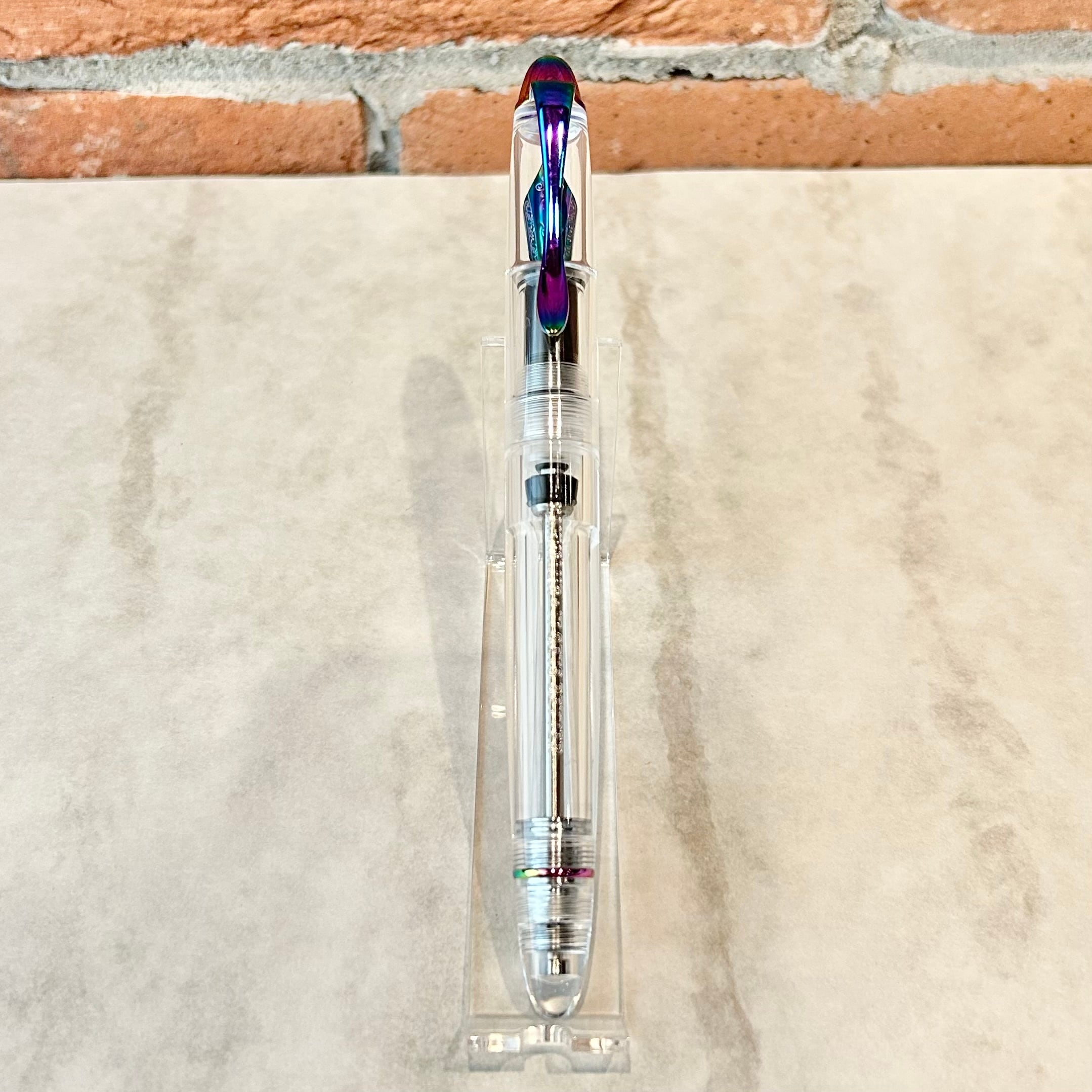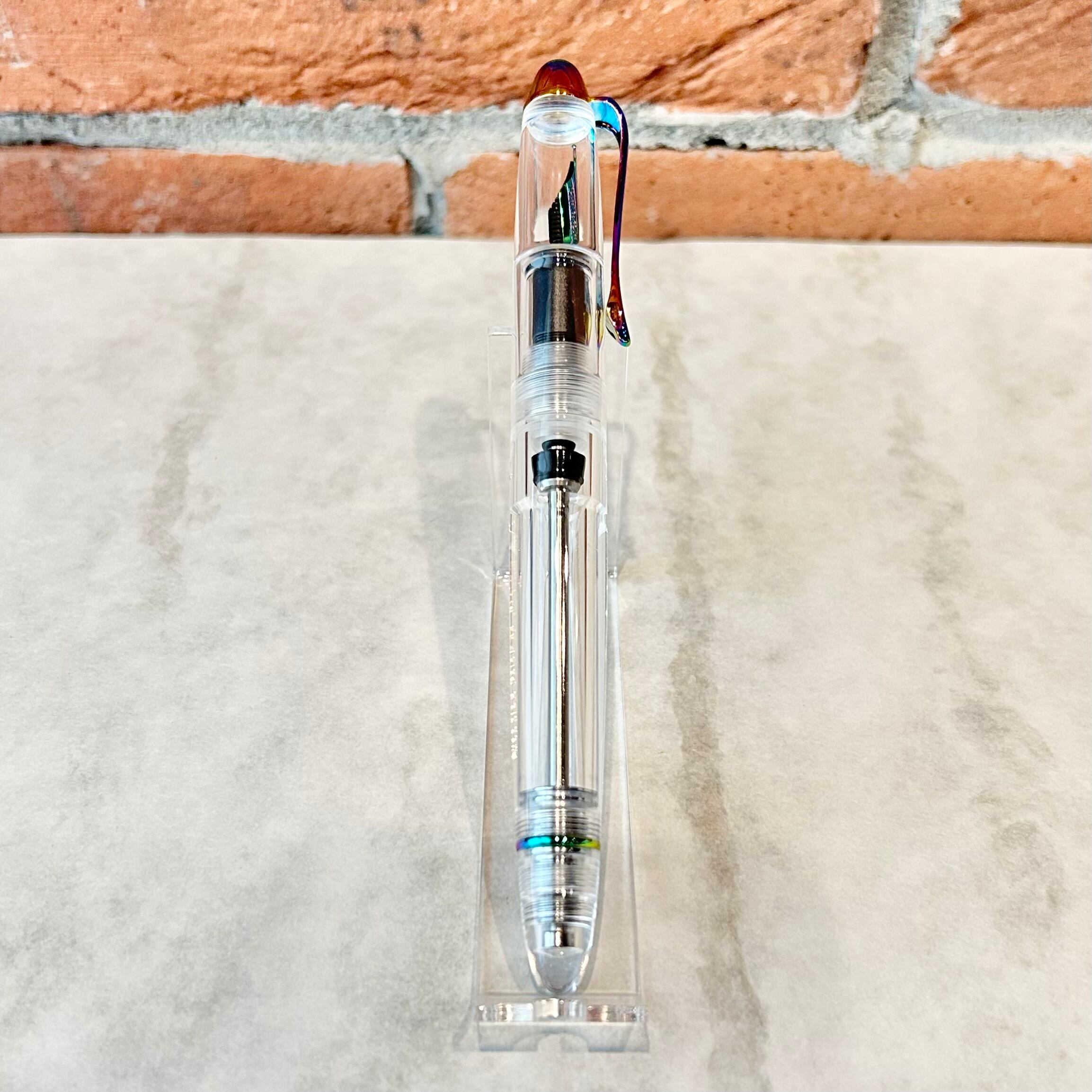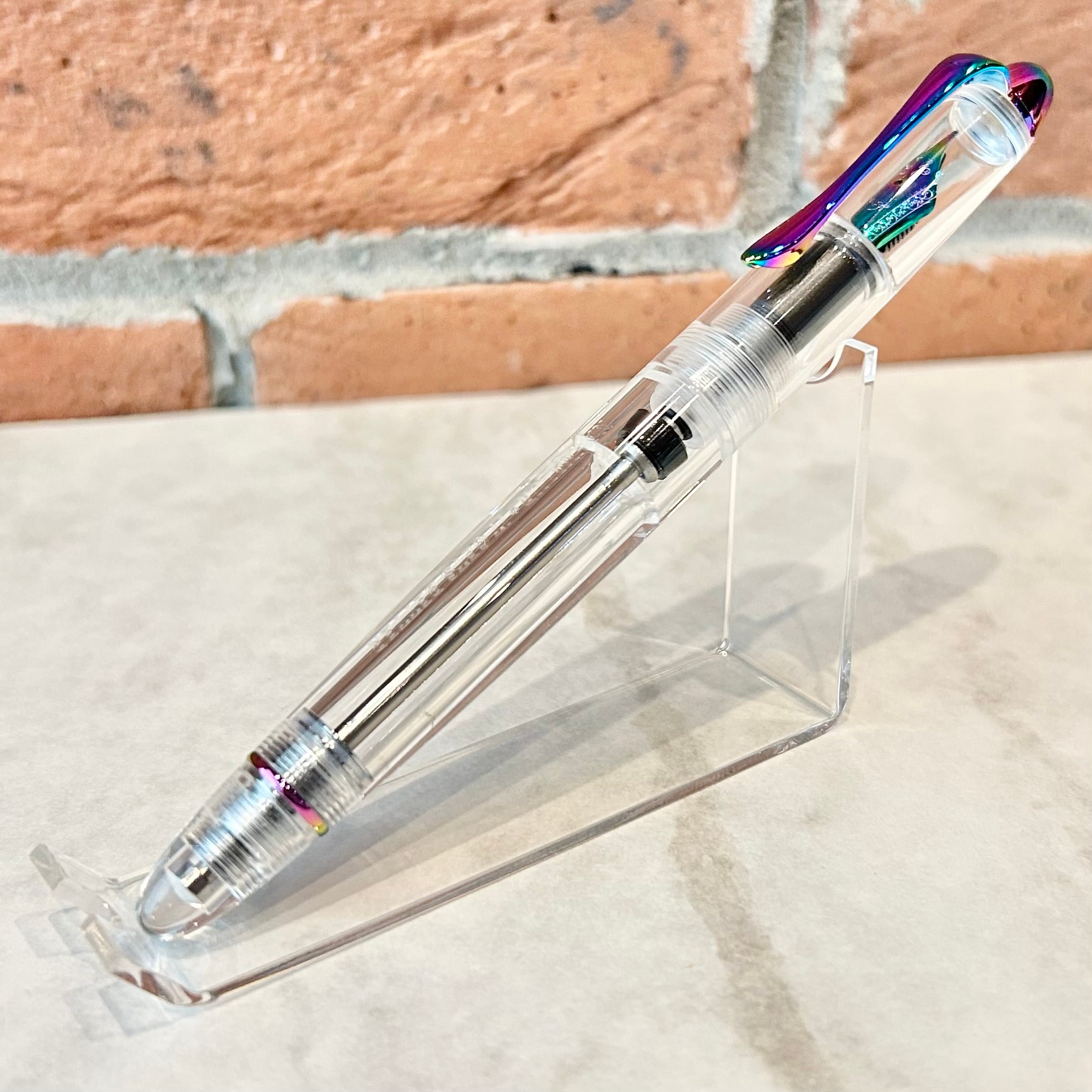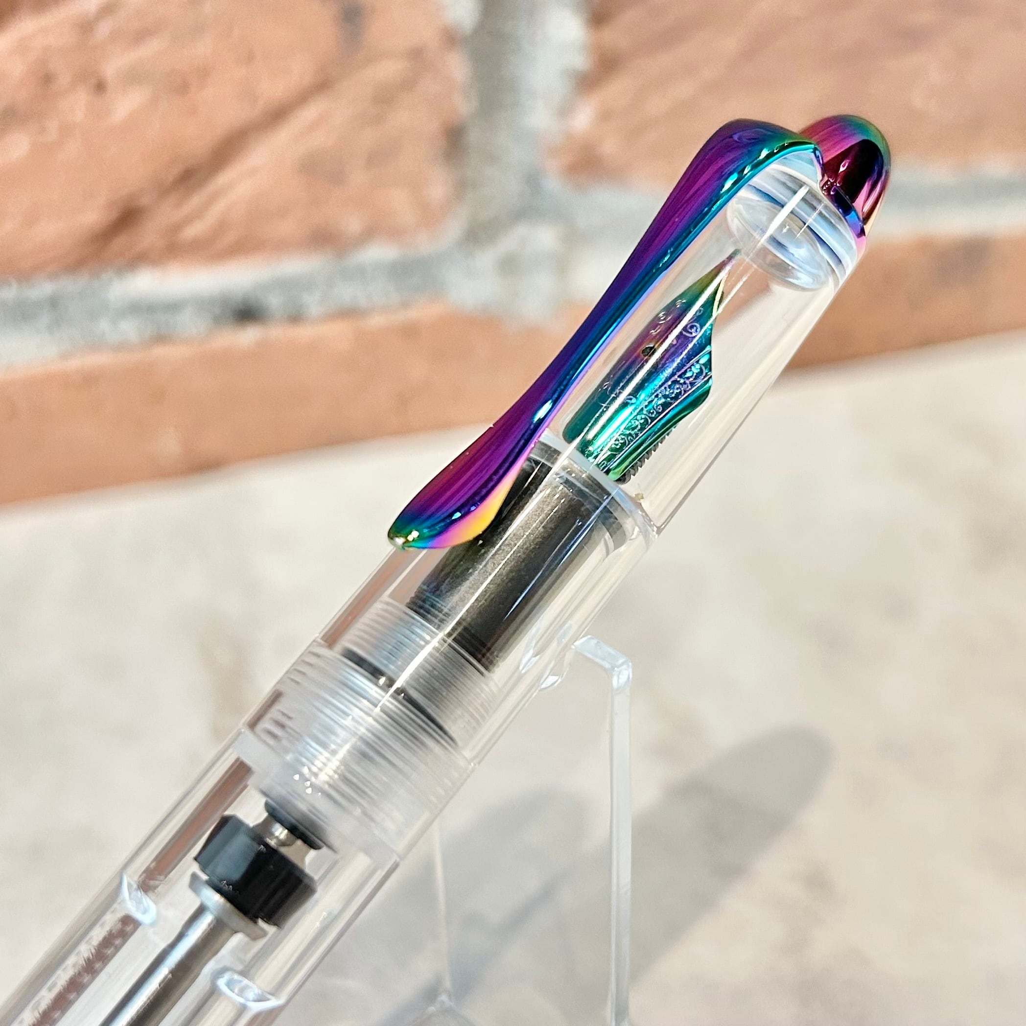 高品質なクリア樹脂で作られた軸により、真空充填機構の細部までしっかりと見ることができ、虹色に輝くペン先と波をイメージしたクリップがアクセントになっています。
