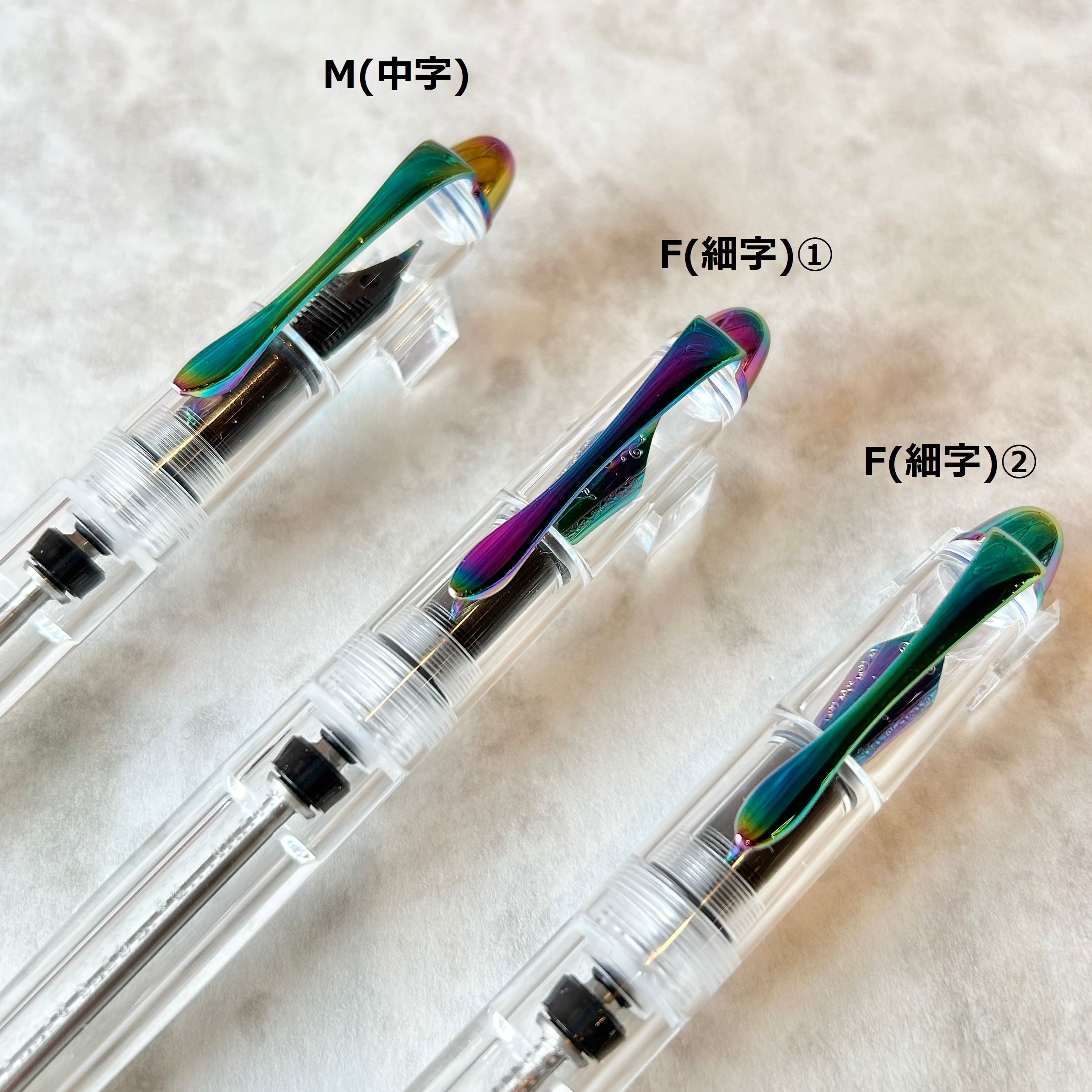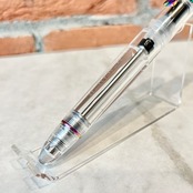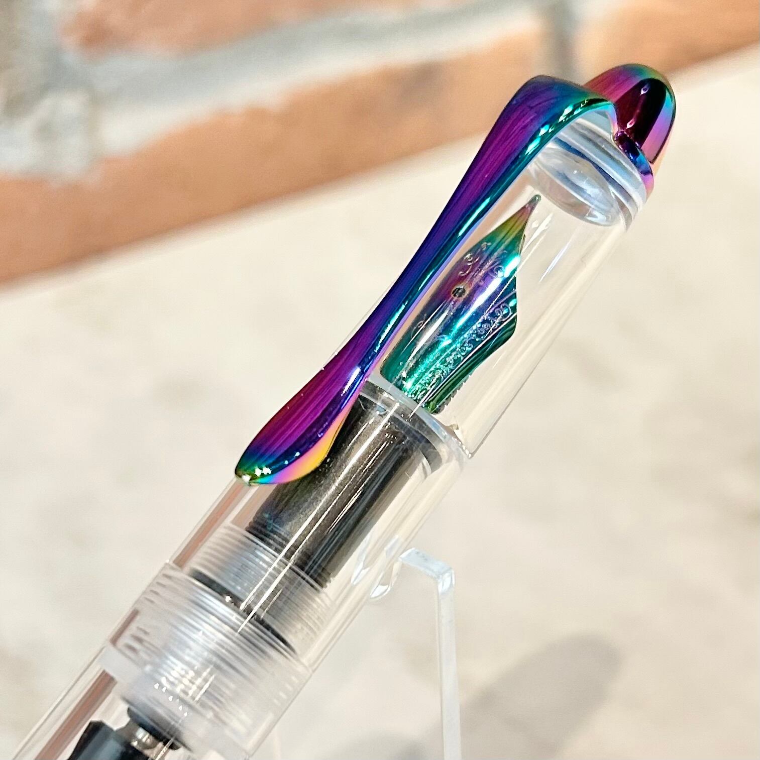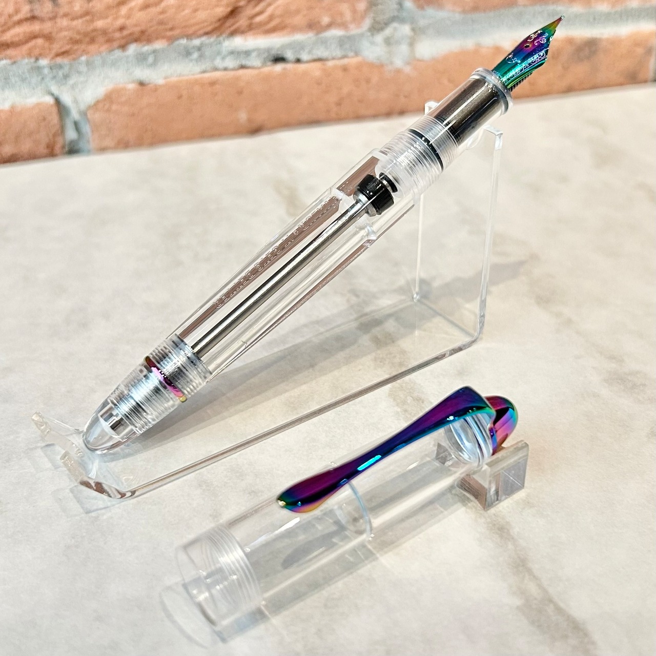 高品質なクリア樹脂で作られた軸により、真空充填機構の細部までしっかりと見ることができ、虹色に輝くペン先と波をイメージしたクリップがアクセントになっています。