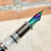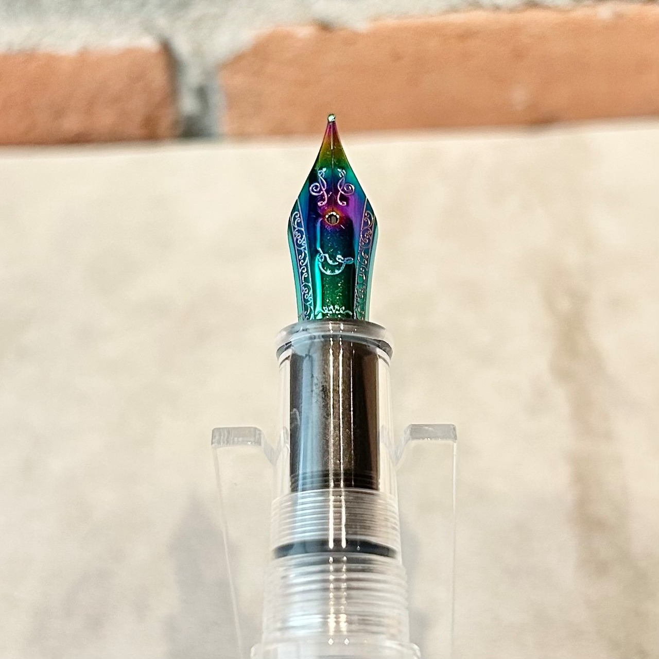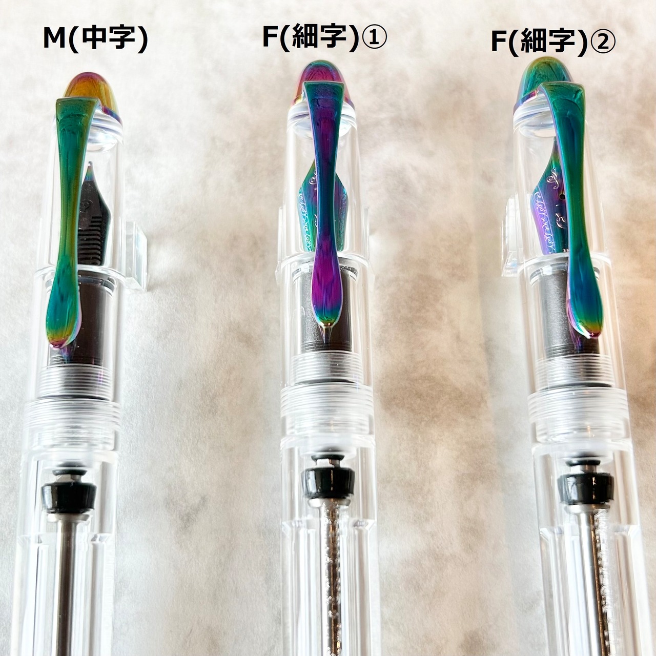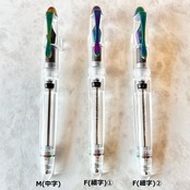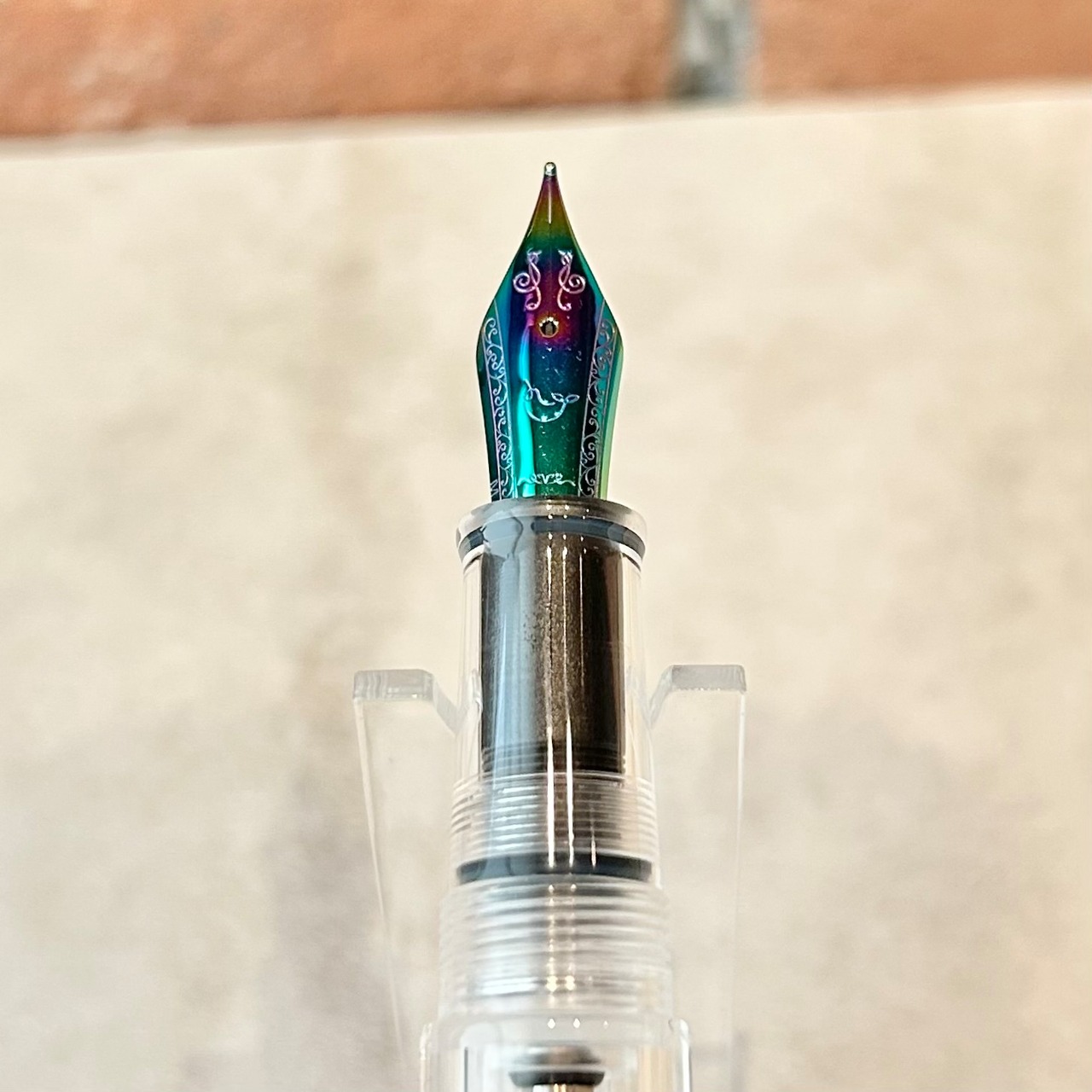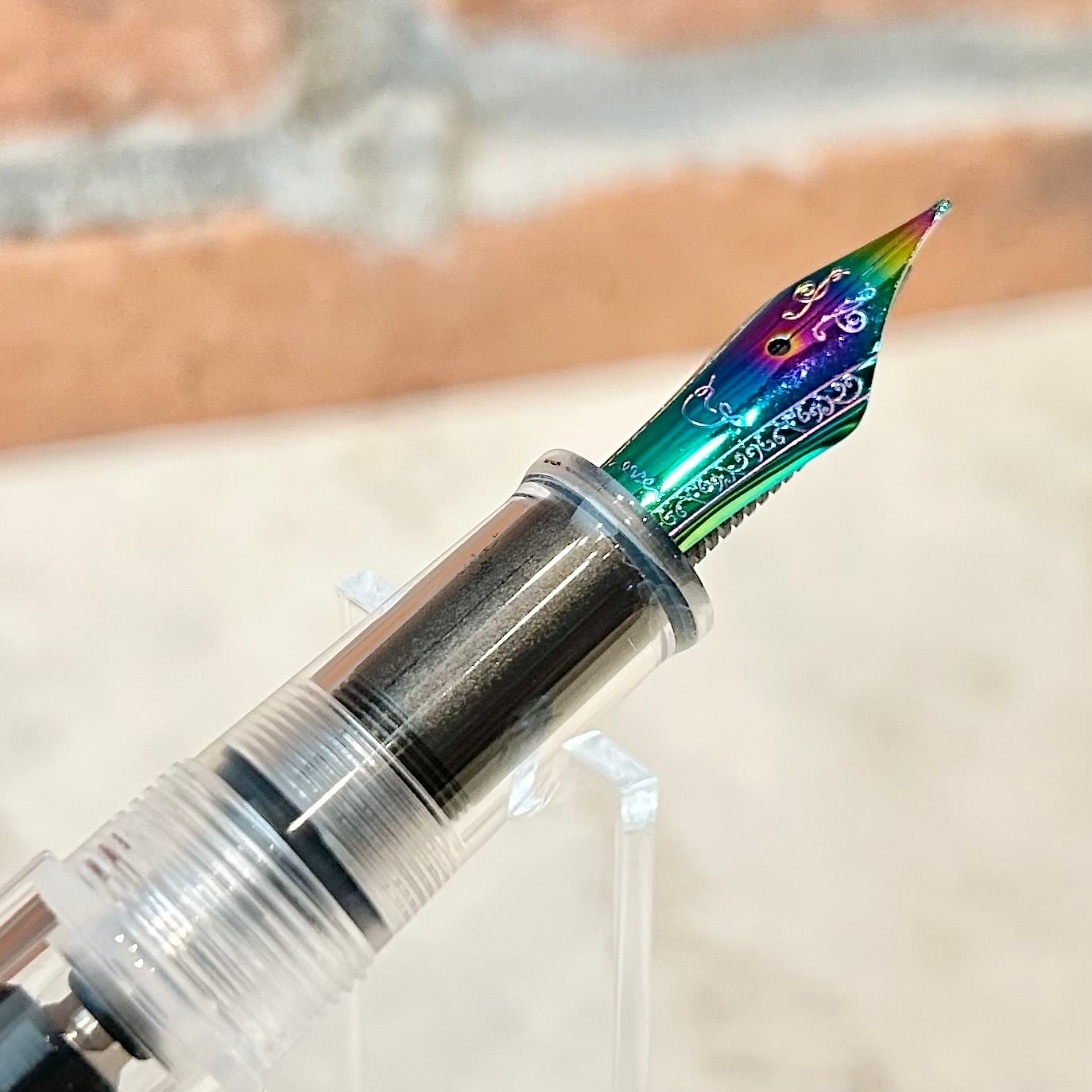 高品質なクリア樹脂で作られた軸により、真空充填機構の細部までしっかりと見ることができ、虹色に輝くペン先と波をイメージしたクリップがアクセントになっています。