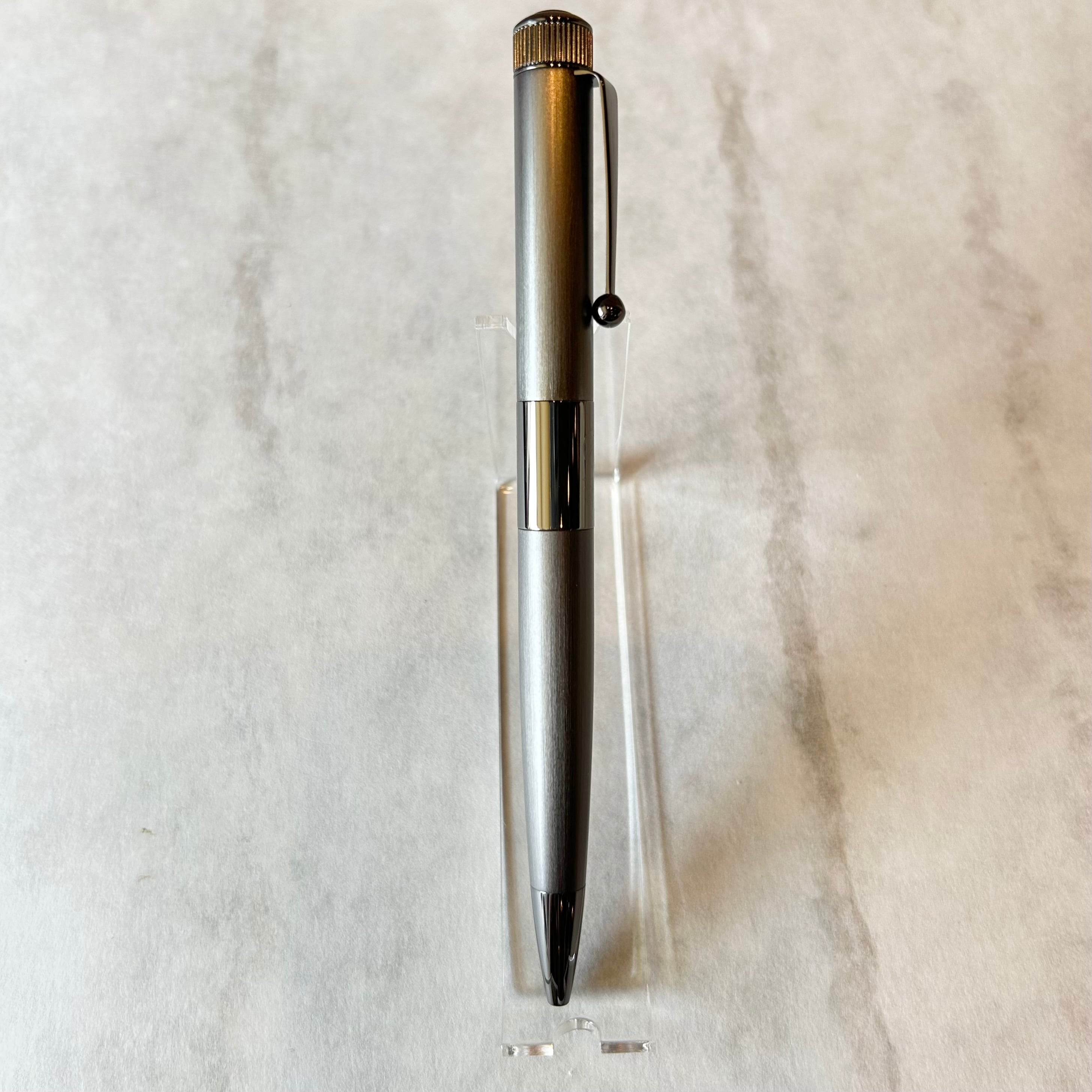 軸径11mmの細軸タイプは、金属らしいメタリック感と質量を味わえるボールペンです。