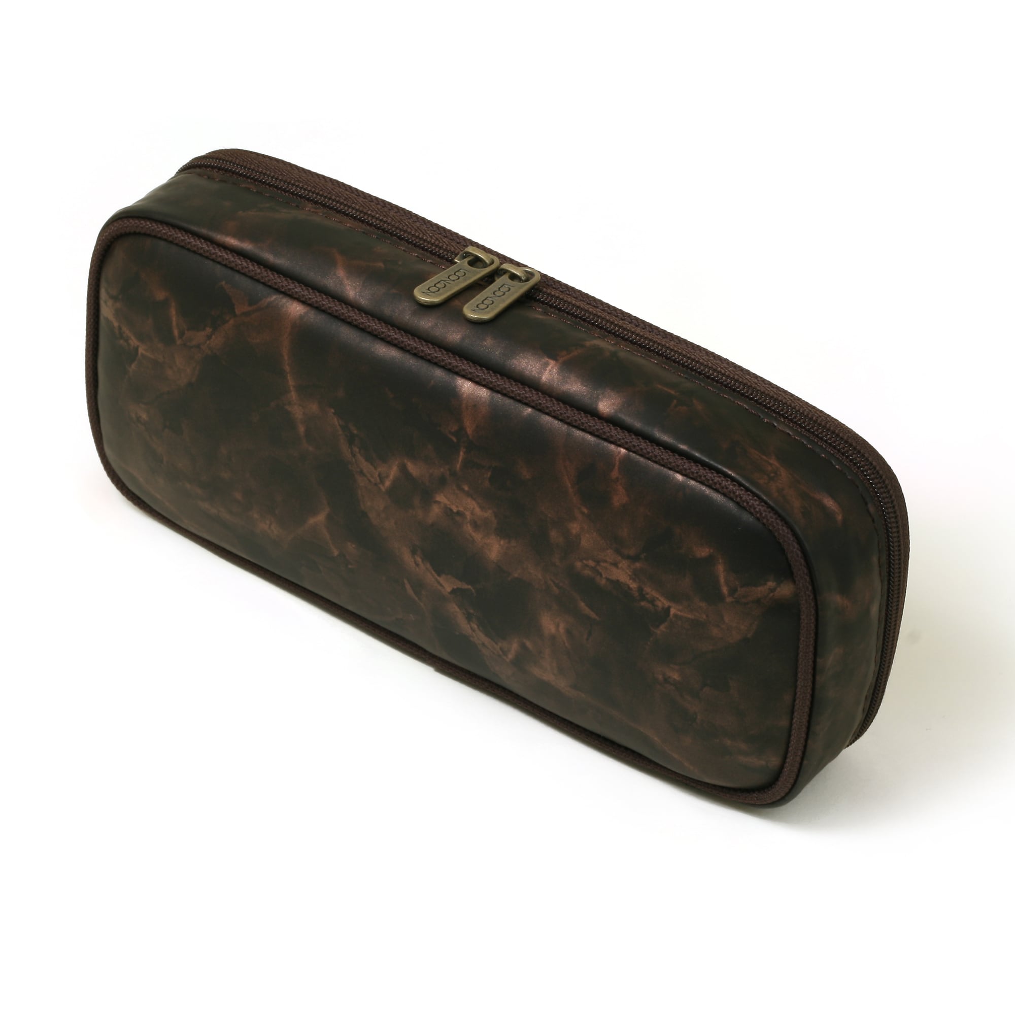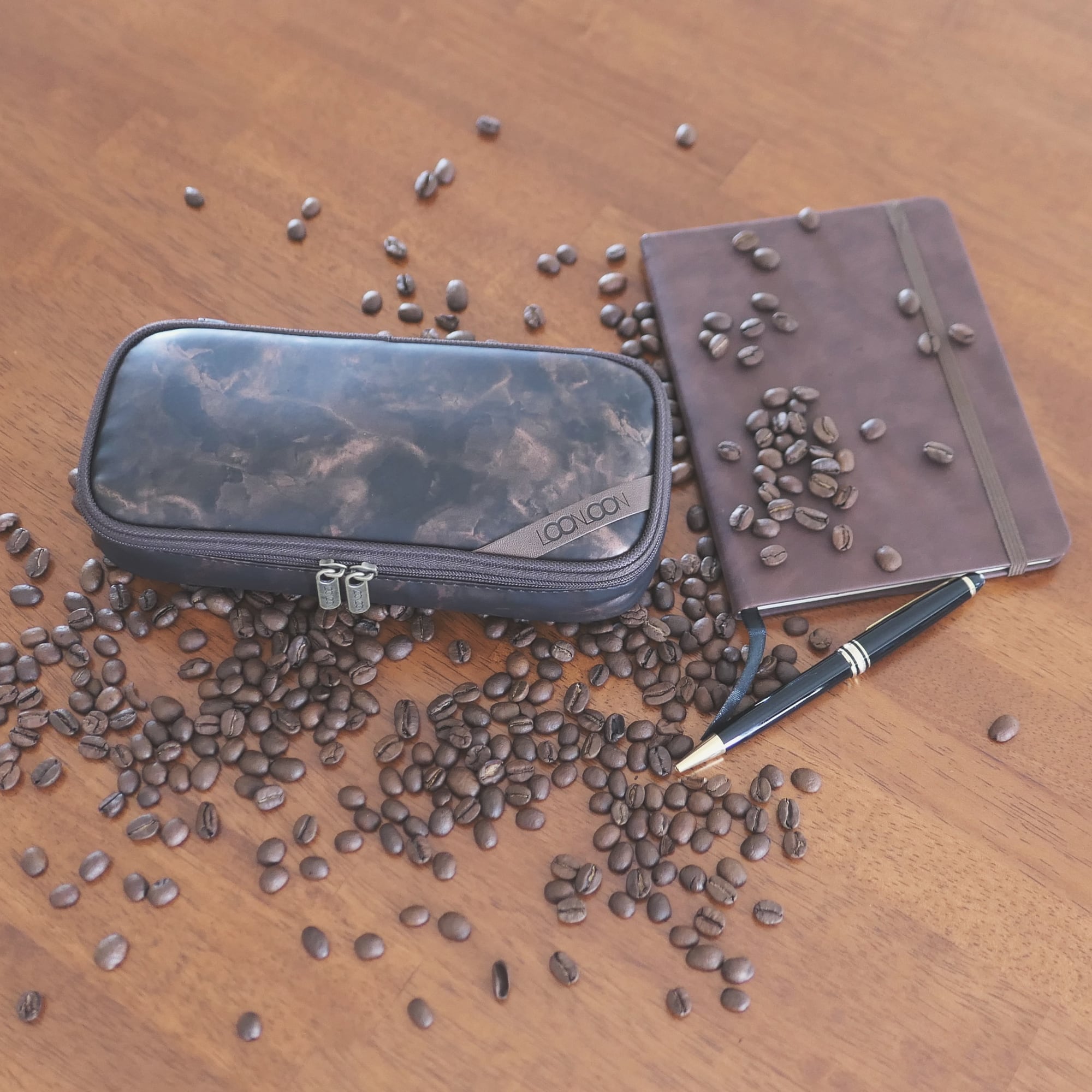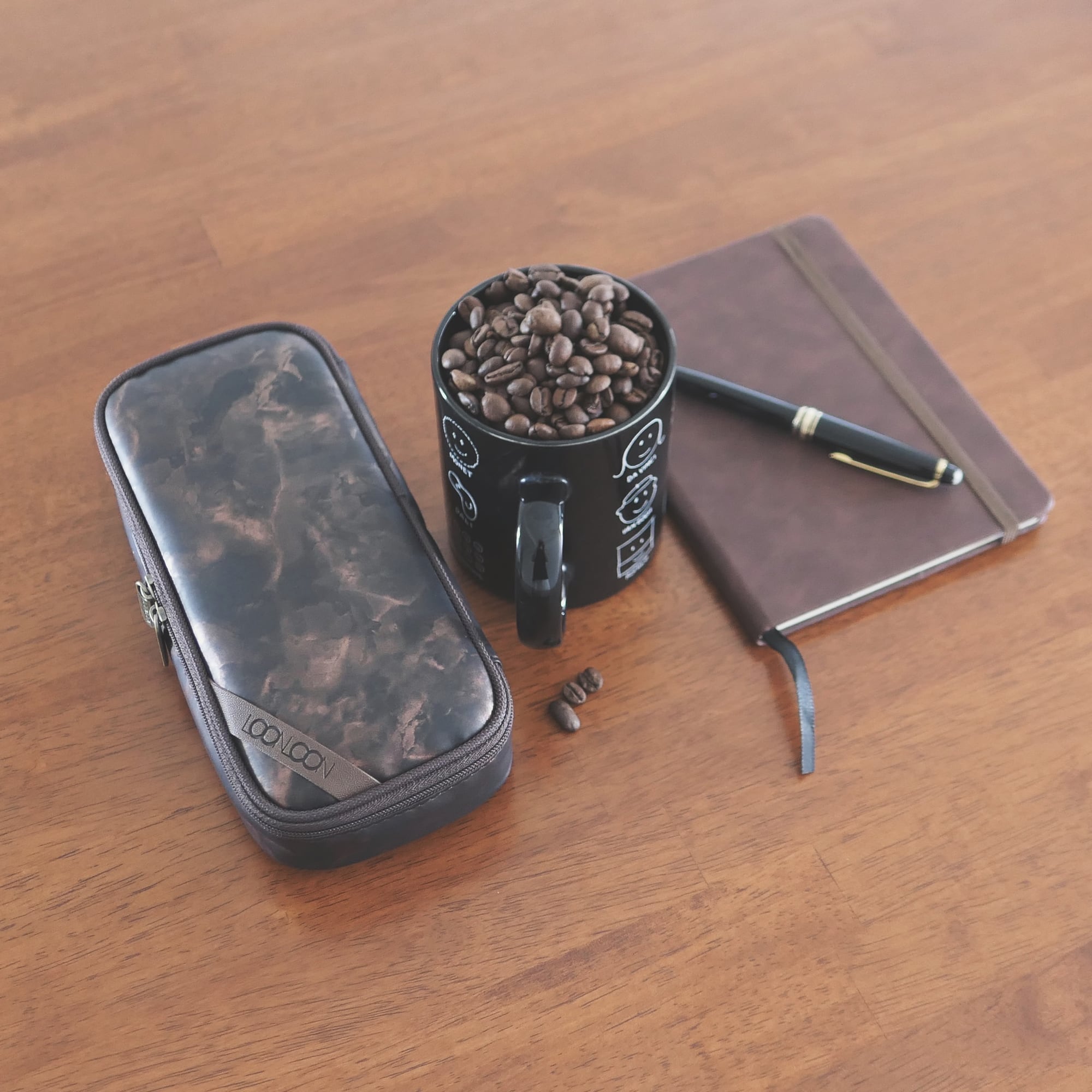 よく焙煎されたコーヒー豆のような色を表現したブラウンカラーをベースに、コーヒーを混ぜたときのようなマーブル模様が特徴のペンケース。