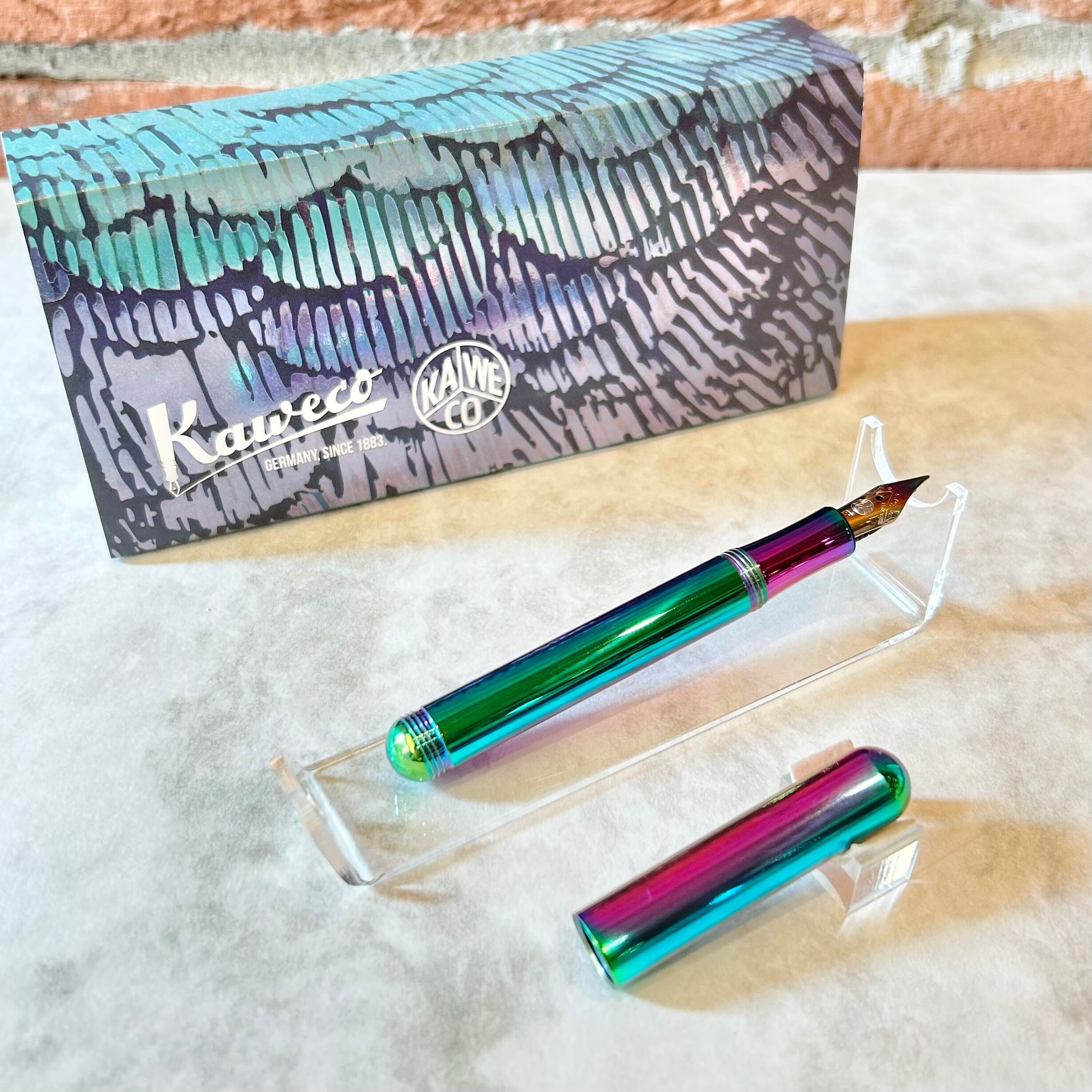 ペン先には虹色に輝く特別仕様のニブを採用し、インクはサマーパープルのカートリッジを搭載しています。
