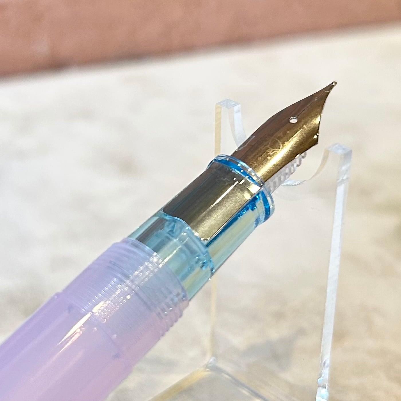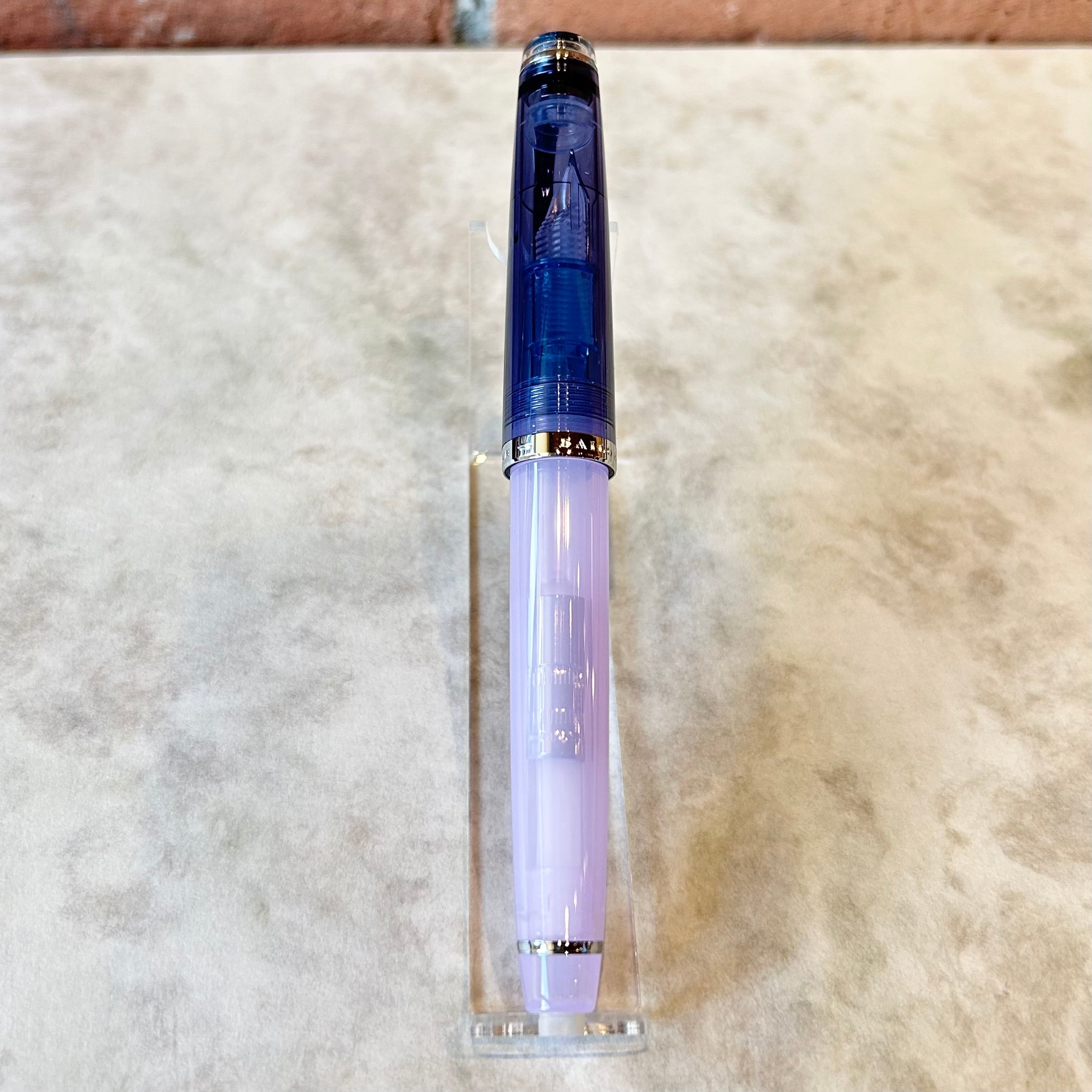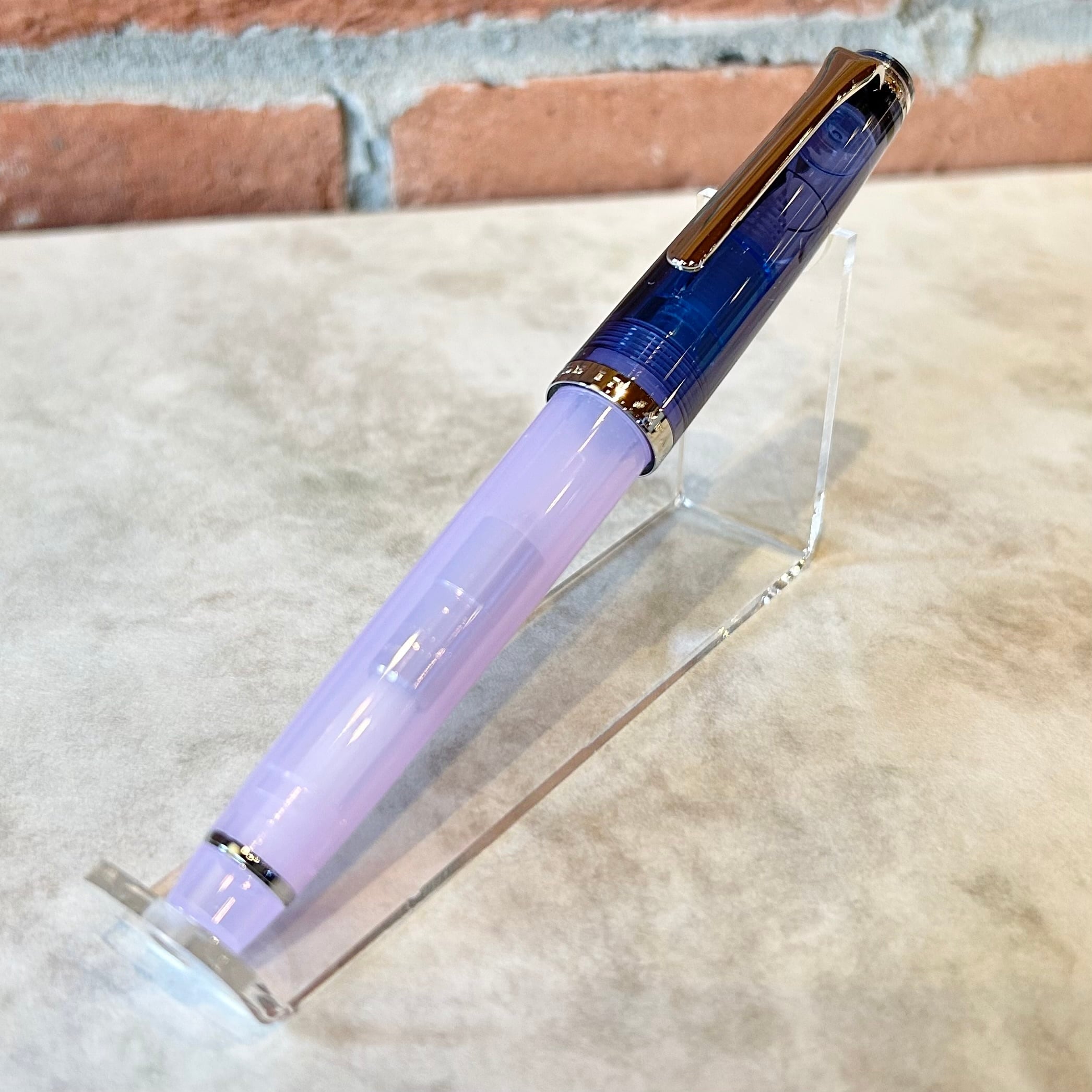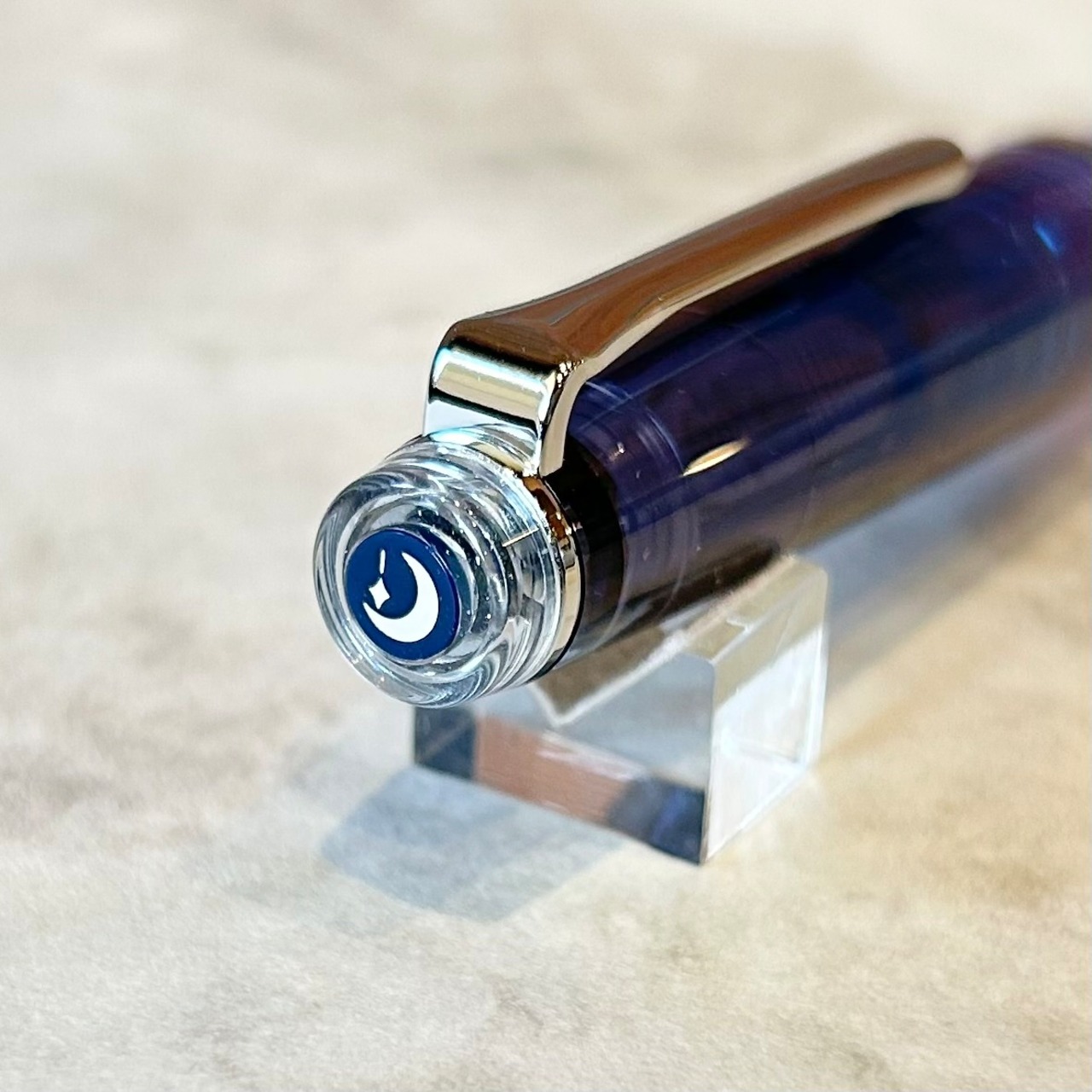 万年筆のキャップには、夜をイメージしたネイビーカラーを、軸部分はパステル調のパープルカラーが施されています。
