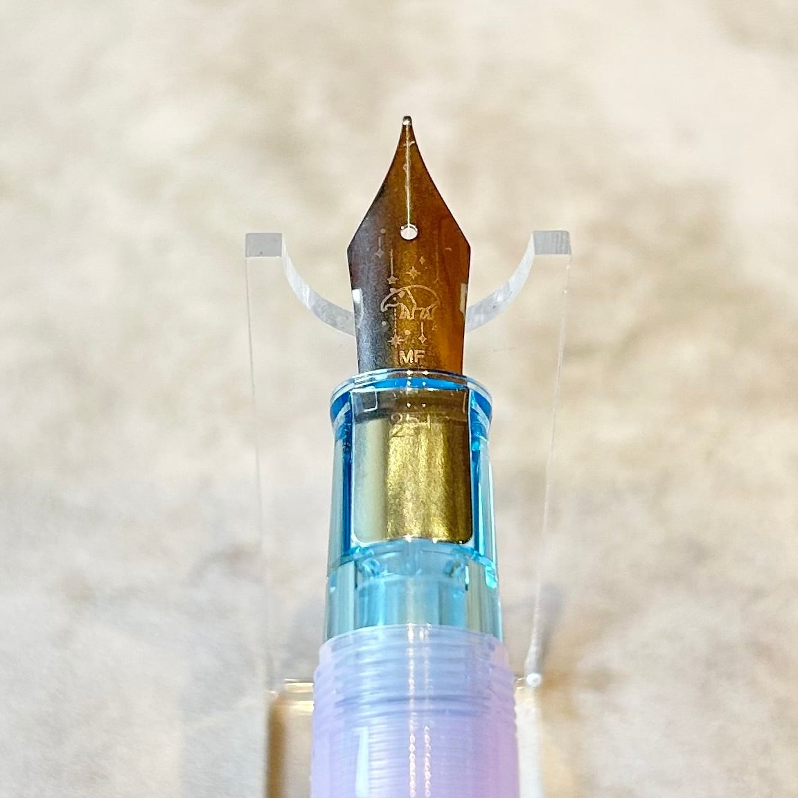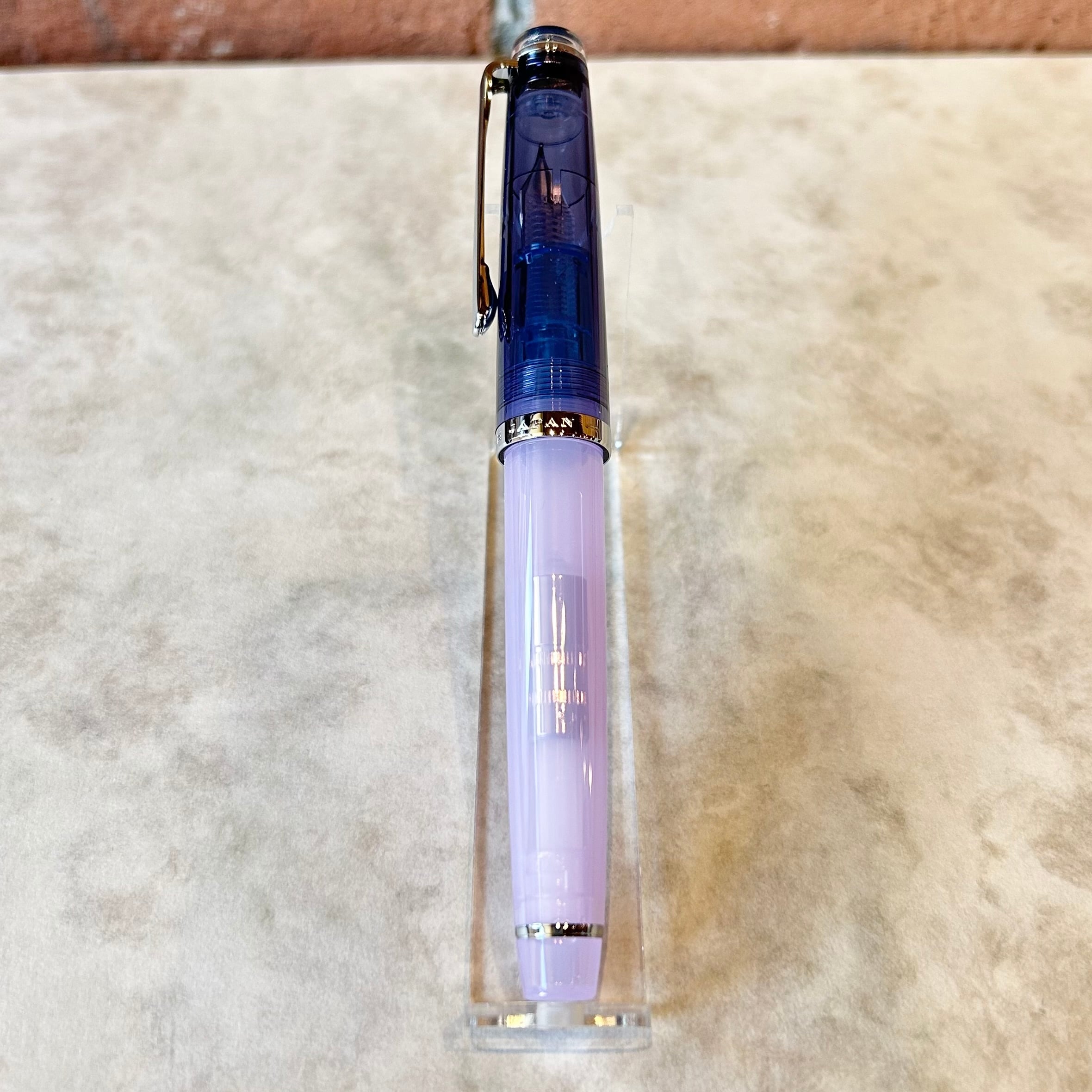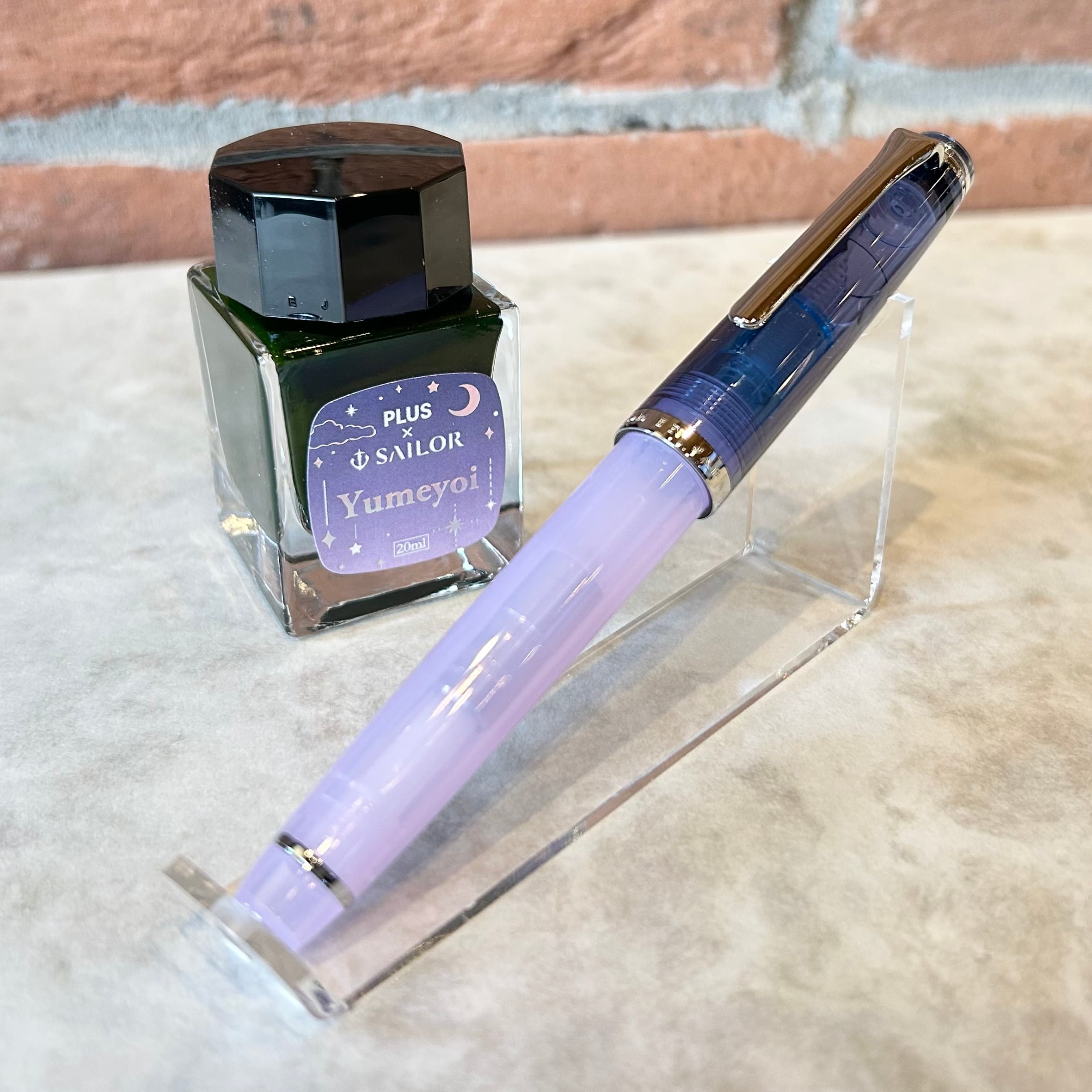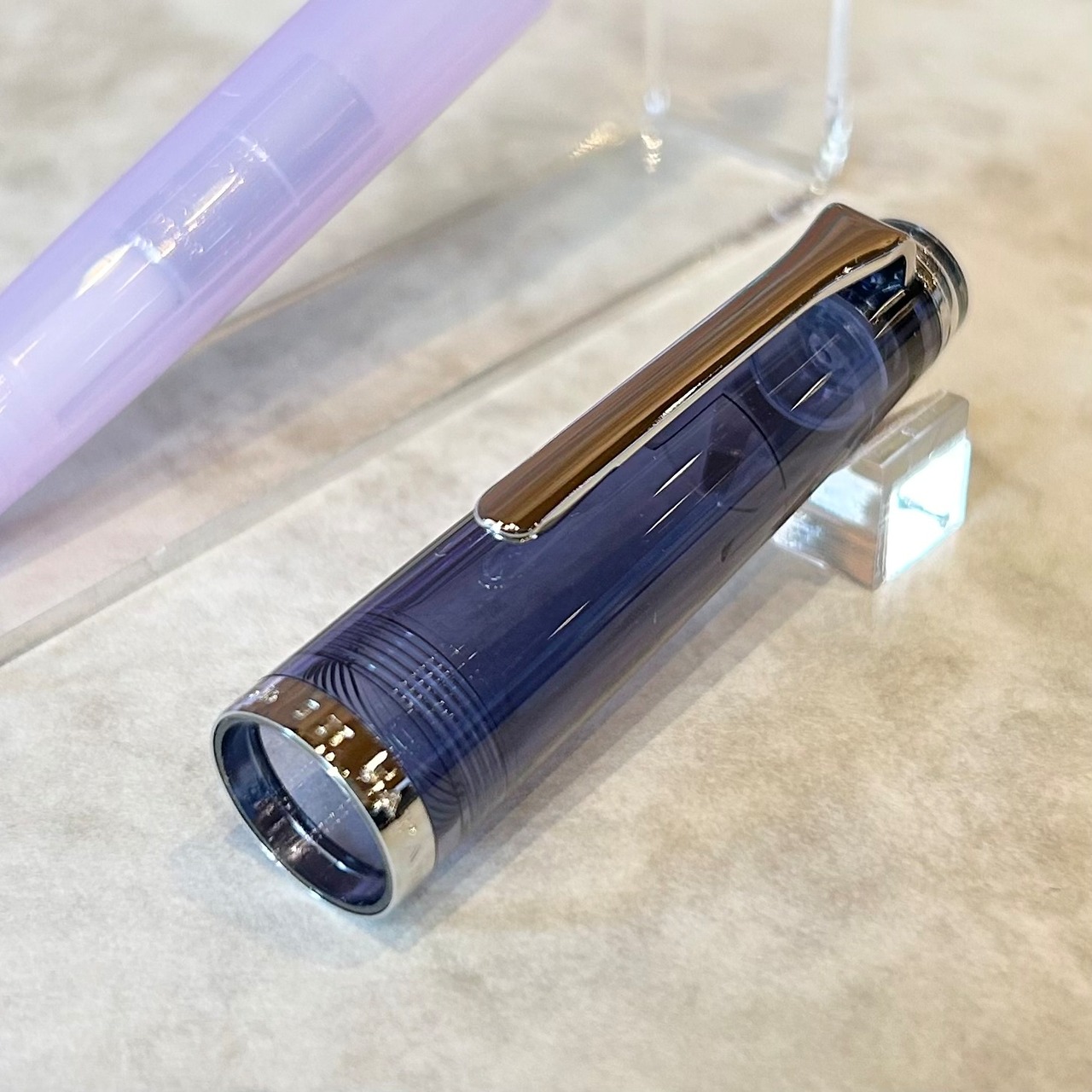 万年筆のキャップには、夜をイメージしたネイビーカラーを、軸部分はパステル調のパープルカラーが施されています。
