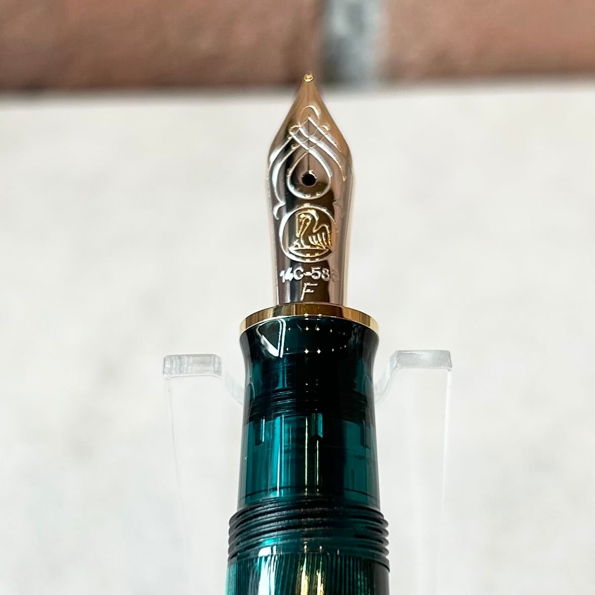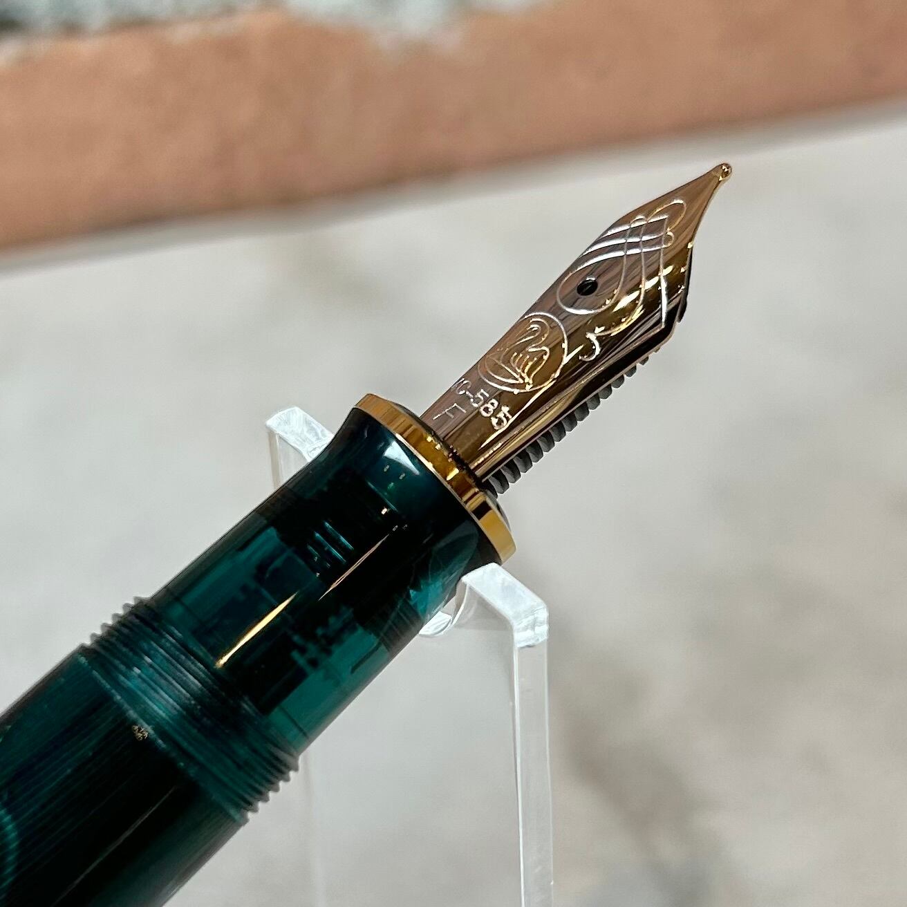 透明感のあるフォレストグリーンの美しい発色とともに、バレルには「オーロラ加工」と呼ばれる高度な製法が丹念に施されています。