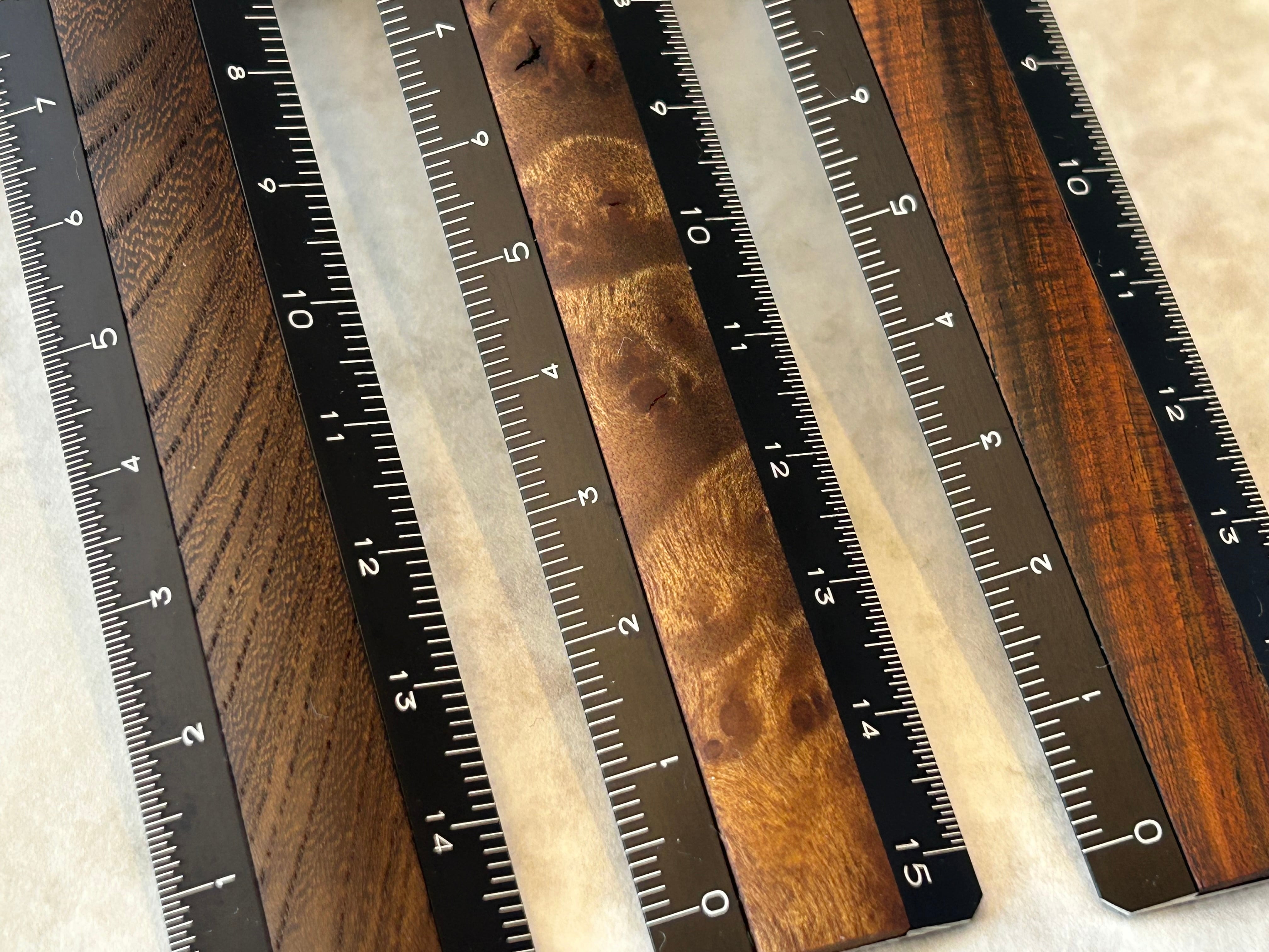 繊細な杢種を加工し、丁寧に15cm定規にはめ込みました