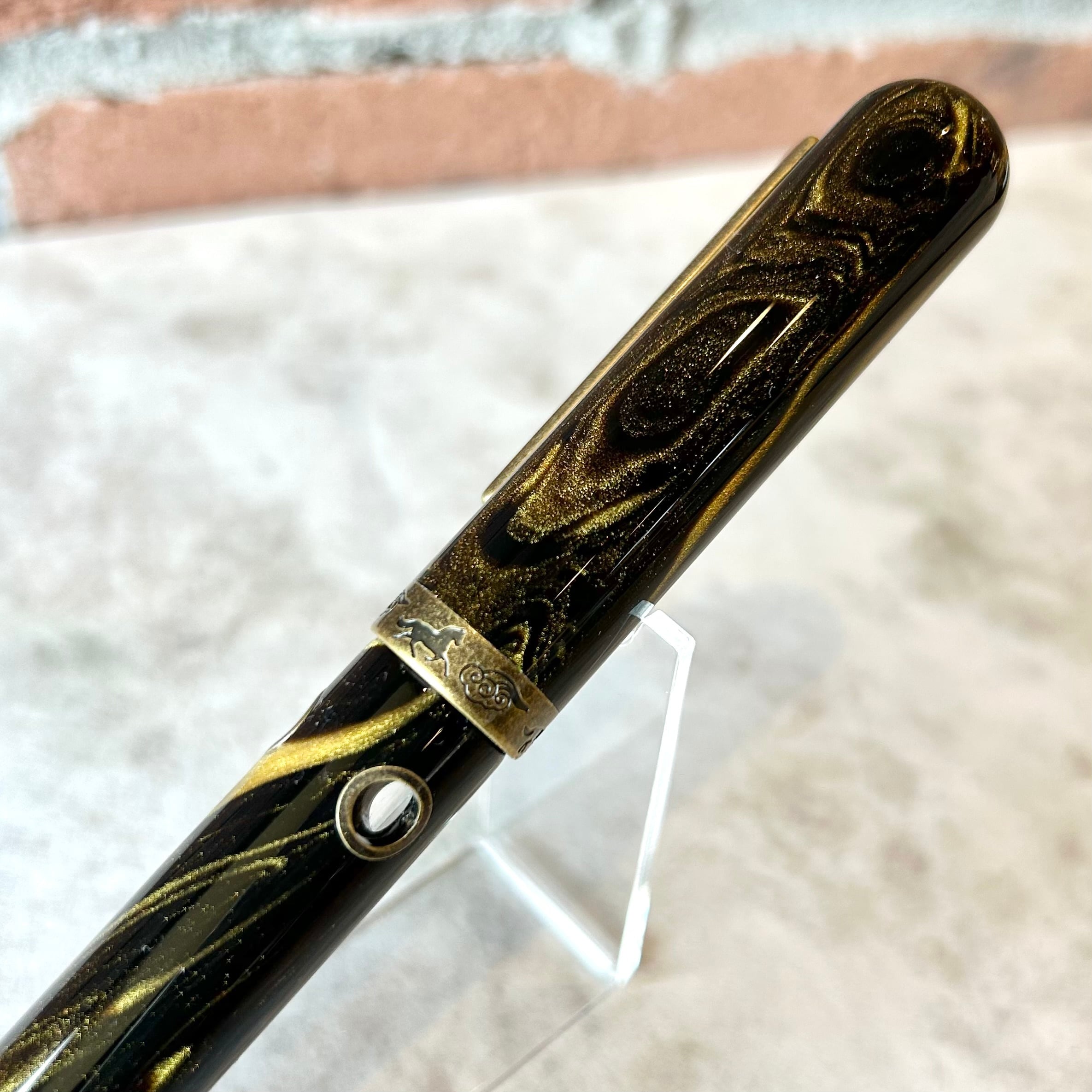 馬と金の樹脂が渦を描くように重なり合い、深みと躍動感を表現しています。