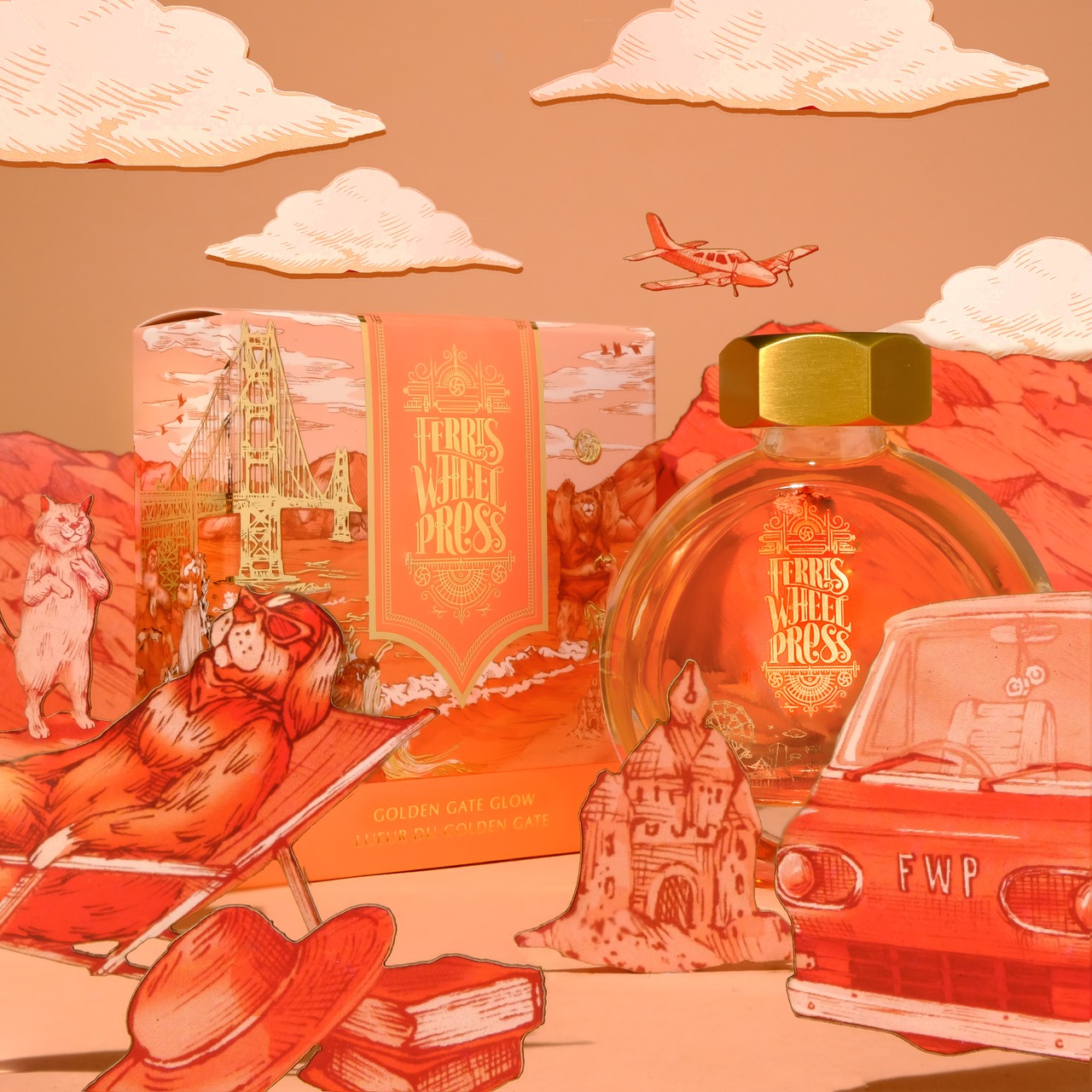 フェリスホイールプレスのインクは、まるで香水瓶のような可愛らしいデザイン&箔押しされた華やかなパッケージが最大の特徴です。使うことはもちろん、目で楽しむこともできる商品です。