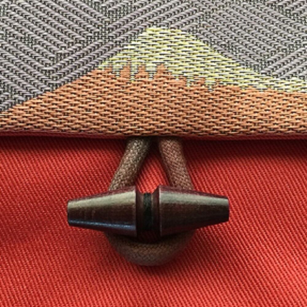 留め部分は、木製のボタンで、グラデーションがきれいな紐で留めてあります。